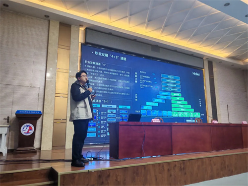本次活动由副校长张江主持,天津海尔洗涤电器有限公司人力资源部经理许万鹏以“携手共创赢未来”为主题,为师生们带来了一场兼具深度与温度的分享。从传统家电制造的“精工时代”,到智能家电研发的“创新浪潮”;从覆盖全球的市场布局,到独树一帜的“人单合一”管理模式,许经理以生动的案例、详实的数据,深入浅出地铺展出海尔集团的发展脉络与品牌实力。更让在场学生心潮澎湃的是,他聚焦“薪资待遇、福利保障、职业晋升”三大核心关切,用清晰的晋升路径图、完善的福利体系介绍,为同学们勾勒出技能人才的成长蓝图,瞬间点燃了大家的职业期待。