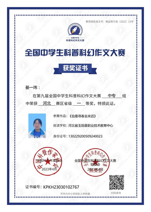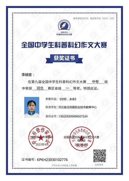 全国中学生科普科幻作文大赛由中国科普作家协会举办,是新时代中学生展现科学素养、想象力、创造力与写作能力的平台,该赛事也是教育部公示认可的面向中小学生的全国性竞赛活动。评委由具有高级专业技术职称、学科(行业)内的权威专家学者和科普领域内高水平的科普作家、科幻作家、理论家、评论家、编辑家、翻译家和组织工作者担任。此项比赛我校高度重视,积极组织,经过财经专业部语文组教师精心筛选,共推送了12篇优秀学生作文参赛。