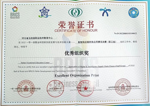 近日,我校收到了2022一带一路暨金砖国家技能发展与技术创新大赛数智供应链财务应用赛项决赛(职工组)成绩证书、奖牌,夏俊英老师在比赛中获得二等奖,学校获评优秀组织奖。