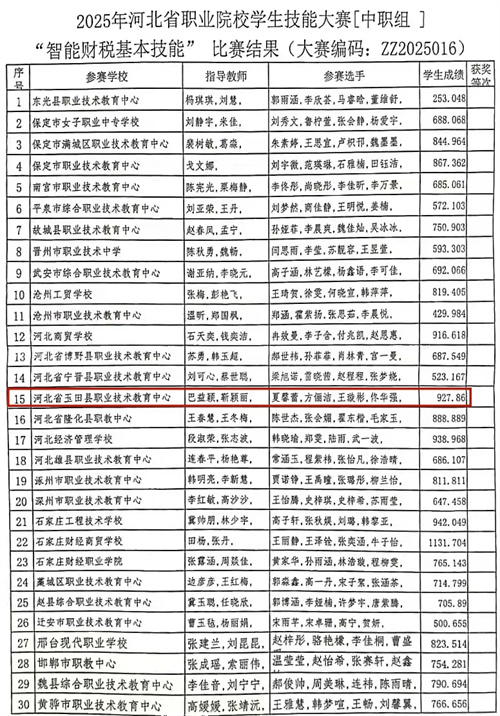 12月5日,2025年河北省职业院校学生技能大赛(中职组)“智能财税基本技能”赛项在石家庄财经商贸学校举行,玉田职教中心代表队获省赛二等奖。