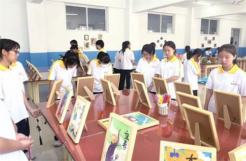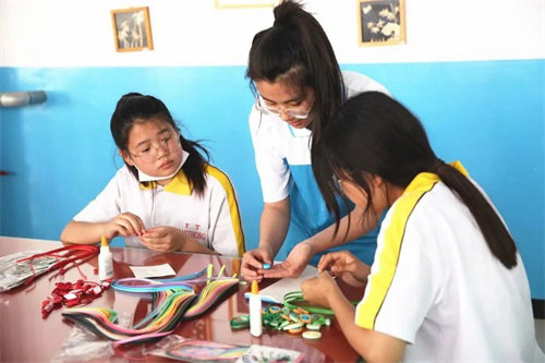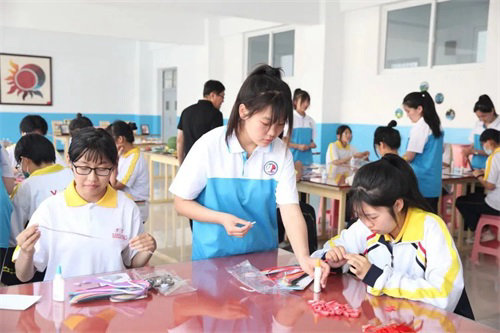 幼儿教育专业则是女同学施展才艺的舞台,在手工实训室,指导教师刘明辉示范了衍纸画的制作流程,社团学生和三中学生结对服务,从卷纸、粘贴到细节修整,两校同学手把手、面对面,欢声笑语中,一颗颗年少的心被手工技艺独有的美悄悄浸润,一幅幅感人的画面也就此定格。手工课后,来校师生还参观了石头画、刺绣、编筐、纸浆画、皱纹纸等手工作品,在接连不断的赞叹中,大家对“手注定为美而挥洒”有了更新的认识。