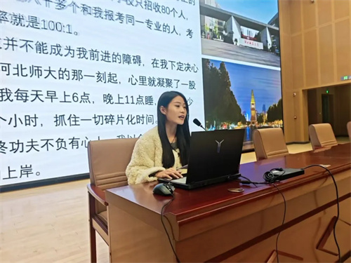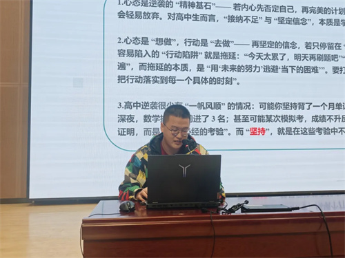 “大家想知道如何用对方法实现成绩逆袭吗?想提前看见大学的样子吗?” 靖荣浩老师以《逆袭筑梦,高中高效学习指南与大学精彩前瞻》为主题,把自己的 “逆袭经验” 倾囊相授。他不仅分享了学科的高效记忆法、刷题技巧,还通过照片、视频展示河北师范大学的课堂、社团生活,让同学们直观感受 “努力后的精彩未来”,瞬间点燃备考热情。