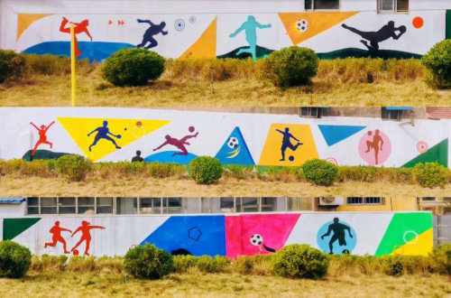 在刘博老师的统筹指导和何慧娟老师的精心策划下,师生团队严格遵循玉田三中办学理念与文化特质,以足球运动为核心主题,系统整合艺术创意要素,通过科学规划与精心施工,高质量完成了总长53米、高2米的足球主题文化墙绘工程。作品融合动态构图、校徽元素、团队协作场景等多元艺术语言,生动展现了两校资源共享、协同发展的合作愿景。项目实施过程中,双方师生就设计细节反复磋商,玉田三中师生深度参与色彩方案论证与局部创作实践,最终以跨校协作模式共同完成了这一彰显文化交融的校园艺术景观。