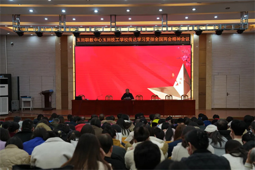 3月14日,我校于阶梯教室召开玉田职教中心玉田技工学校传达学习全国两会精神会议。校领导班子全体成员出席会议,全校教职工参加会议。会议由学校党委书记张铁庄主持。
