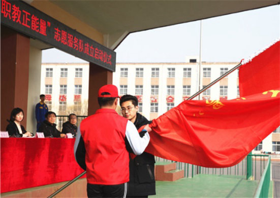 启动仪式中,国旗班学生庄严出旗,全体师生齐唱国歌。金奕金同志为“职教正能量”志原服务队学生代表授旗,机修专业部团支部书记魏斌带领志愿者们进行了集体宣誓,学生代表李佳阳作了表态发言,表达了“学党史,跟党走,把握当下,励志奋进的青年心声,袁媛书记向我校成立“职教正能量”志愿服务队表示了祝贺,肯定了我校多年来取得的成绩,并希望同学们继承“党有号角,团有行动”的优良传统,学习党史,践行使命,为建设“科创商贸名城,京东魅力干田”和中华民族的伟大复兴做出自己的贡献,张铁庄校长号召同学们从行动上做到甘于奉献、踏实勤恳、坚韧执看,以史鉴今,修身立德,在青春征程中奉献自我,在奋斗中唱响新时代的青春之歌。