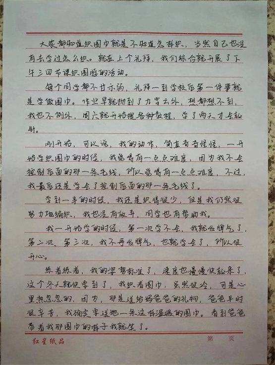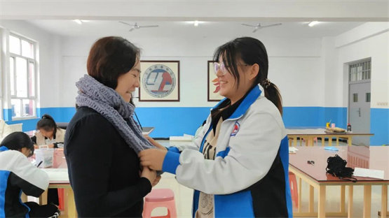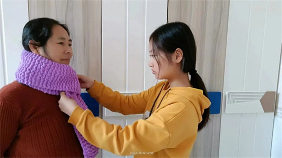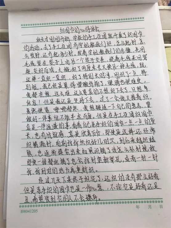 活动中,专业课教师对学生进行一对一的教学指导,大家兴趣浓厚,全身心投入,教室里、宿舍里都能看到她们织围巾的身影。大家还把活动感想记录下来,作为成长的记忆。很多同学都是第一次尝试,看着自己的劳动成果,看到亲人脸上洋溢的幸福,还有什么比这更开心的呢?