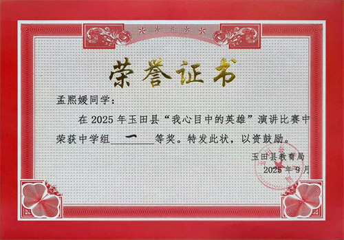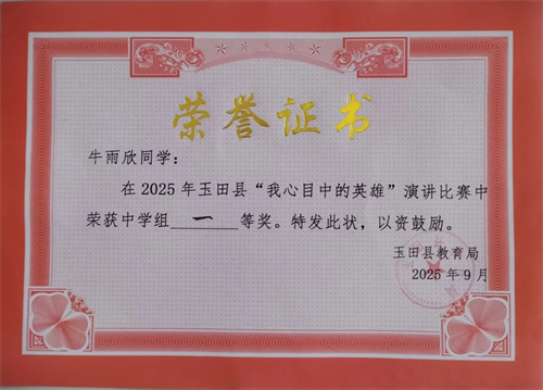 9月29日,玉田县中小学生“我心目中的英雄”主题演讲比赛圆满落幕。我校综合专业部学生牛雨欣、孟熙媛凭借扎实的语言功底与深刻的情感表达在中学组30位参赛选手中双双斩获一等奖,其中牛雨欣同学以优异表现夺得一等奖第一名,为学校赢得荣誉。