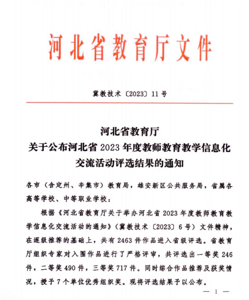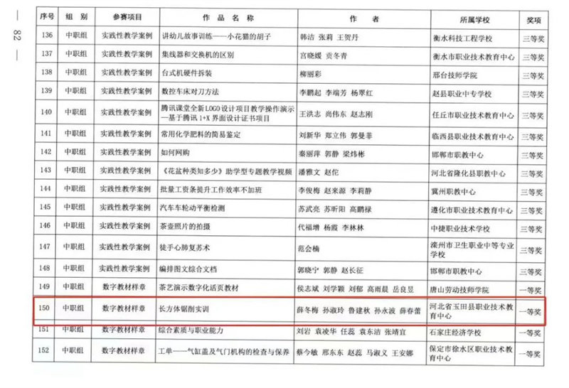 喜报!依据河北省教育厅发布的《关于公布河北省2023年度教师教育教学信息化交流活动评选结果的通知》,我校薛冬梅、孙书玲、鲁建秋、孙永波、薛春蕾五位教师的参赛作品《长方体锯削实训》斩获数字教材样章项目一等奖,同时入围国赛。
