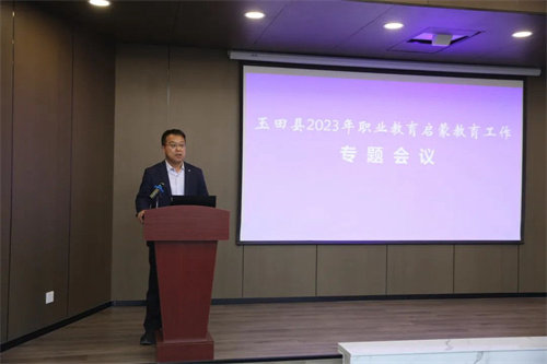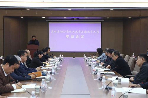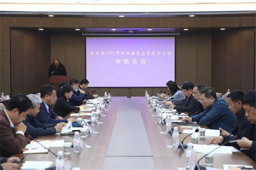 4月25日下午,全县2023年职业教育启蒙教育专题会议在我校培训楼二楼会议室召开。县教育局副局长郑志刚、杨洪全、陈德英,局机关相关科室负责人,各学区、乡镇教育事务中心主任,初中学校负责人及我校党委书记张铁庄,党委副书记、校长张婧等50余人参加会议,会议由郑志刚副局长主持。