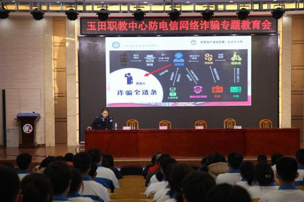 11月10日下午,我校在阶梯教室开展了“防电信、网络诈骗”法制教育会。县公安局政工监督室书记张立军、县网信办宋京华以及我校副校长张江出席,玉田县公安局反诈中心王文明警官主讲。我校各专业部全体班主任、部分班干部230余人参加。