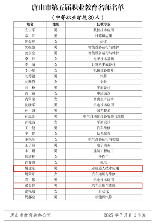 喜讯传来!按照市政府《唐山市名师管理办法》(唐政办发〔2020〕8号)和市教育局、市人力资源和社会保障局《关于组织唐山市第五届职业教育名师申报认定工作的通知》有关要求,全市开展了第五届职业教育名师的认定工作,经过评审、校内考察、公示等环节,我校姚建东、张金位两位教师凭借卓越的专业素养、显著的教育教学成果与深厚的行业影响力,脱颖而出,荣誉当选“唐山市职业教育名师”。这不仅是对两位教师个人能力的至高认可,更是学校矢志不渝推进高水平师资队伍建设的璀璨结晶。