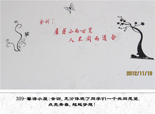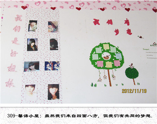 活动中完善了宿舍管理制度,分四个阶段进行环境文化建设:宣传发动阶段,文化建设阶段,评优评先阶段,成果展示阶段。具体开展“温馨之家”宿舍设计评选、文明卫生宿舍评选、“我的宿舍我的家”征文活动、“秀宿舍风采,展个性魅力”宿舍风采展等活动。目前已进行到了第三阶段,正在开展“温馨之家”宿舍设计评选活动。同学们充分发挥了设计才能,彰显了专业特色和学生个性,剪纸、算盘、点钞纸、书法、平面设计作品甚至树叶、萝卜都成了学生的创意载体,学生宿舍弥漫着浓厚的自然气息和文化氛围。